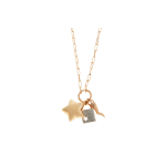 Collana da donna della collezione Raggi, in argento 925 laminato in oro rosa 18kt. La catena forzatina sostiene tre charm simbolici: stellina bombata, lucchetto con zirconi bianchi e cornetto portafortuna. Un gioiello dal fascino contemporaneo che unisce eleganza e significato.