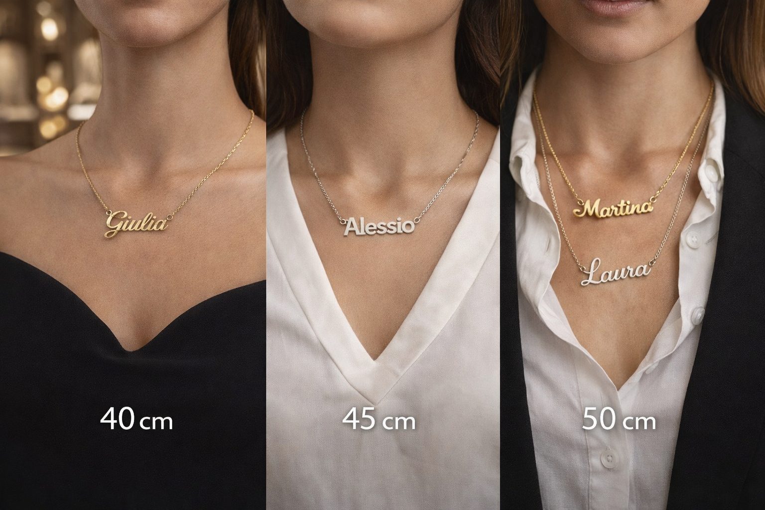Su dolcevita e colli alti funzionano meglio lunghezze più lunghe, di solito 50–60 cm, così il nome “scende” sul tessuto e resta visibile. Se vuoi un risultato più minimal (e meno lungo), 50 cm è spesso la scelta più sicura. - Come faccio a scegliere la lunghezza giusta se devo fare un regalo?