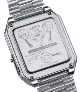 La cassa dal finish argento mantiene un’eleganza sobria che bilancia l’anima pop, mentre la griglia dei tasti tipica dei calculator watch assicura un uso intuitivo per calcolatrice, cronometro e impostazioni. Il risultato è un’estetica “cinematografica” che resta leggibile e funzionale nel quotidiano.